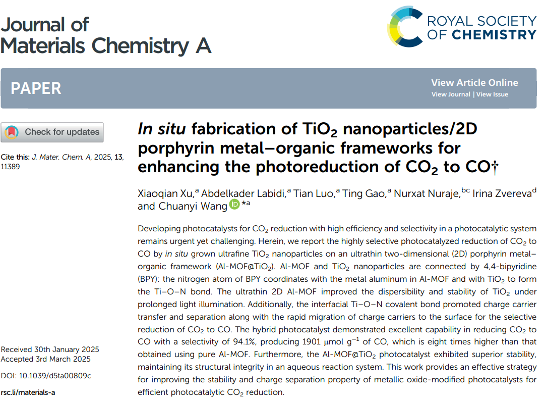 - Enhanced Photocatalytic Performance: The Al-MOF@TiO2 hybrid exhibits a remarkable CO2-to-CO conversion selectivity of 94.1%, achieving a CO production rate of 1901 μmol g⁻¹. This performance is approximately eight times higher than that of the pristine Al-MOF, highlighting the synergistic effect of the TiO2 integration.