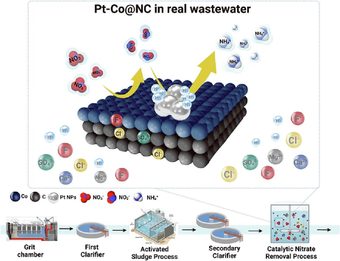 Elevated nitrate (NO3−) levels in water sources, primarily due to agricultural activities, landfills, and inadequate wastewater treatment, pose significant health risks. Traditional nitrate removal technologies face challenges like high costs and byproduct formation. This study aims to explore the catalytic reduction of NO3− to green ammonia (NH3) and ammonium (NH4+) using a Pt-Co@NC (Pt-impregnated core–shell Cobalt N-doped Carbon Nanocage (acid-washed) catalyst), offering a sustainable alternative to the Haber-Bosch process. To elucidate the underlying mechanisms contributing to the superior reactivity of Pt-Co@NC, density functional theory (DFT) calculations were performed, aiming to provide an in-depth understanding of the nitrate reduction process that facilitates the selective conversion of NO3– to NH4+. We proved that the Pt cluster can provide a favorable environment for hydrogenation steps in nitrate reduction. Based on calculation results, with experiments and kinetic modeling, we optimized conditions such as hydrogen flow rate (200 mL⋅min−1) and NO3− concentration (5 m g⋅L-1) to maximize efficiency and selectivity. In following synthetic wastewater tests, the Pt-Co@NC catalyst maintained high NH4+ selectivity and efficient NO3− reduction despite the presence of competing ions, demonstrating robust performance with a kinetic rate constant of 6.67 × 10-2 min−1. These results advance our understanding of NO3− reduction mechanisms and provide a viable solution for sustainable nitrate removal and ammonia production. The Pt-Co@NC catalyst’s effectiveness in controlled and synthetic wastewater conditions highlights its potential applicability in real-world water treatment scenarios. The insights on the catalyst design and its operational optimization could lead to the development of advanced catalytic materials and green technologies for efficient treatment and remediation of contaminated water environments.