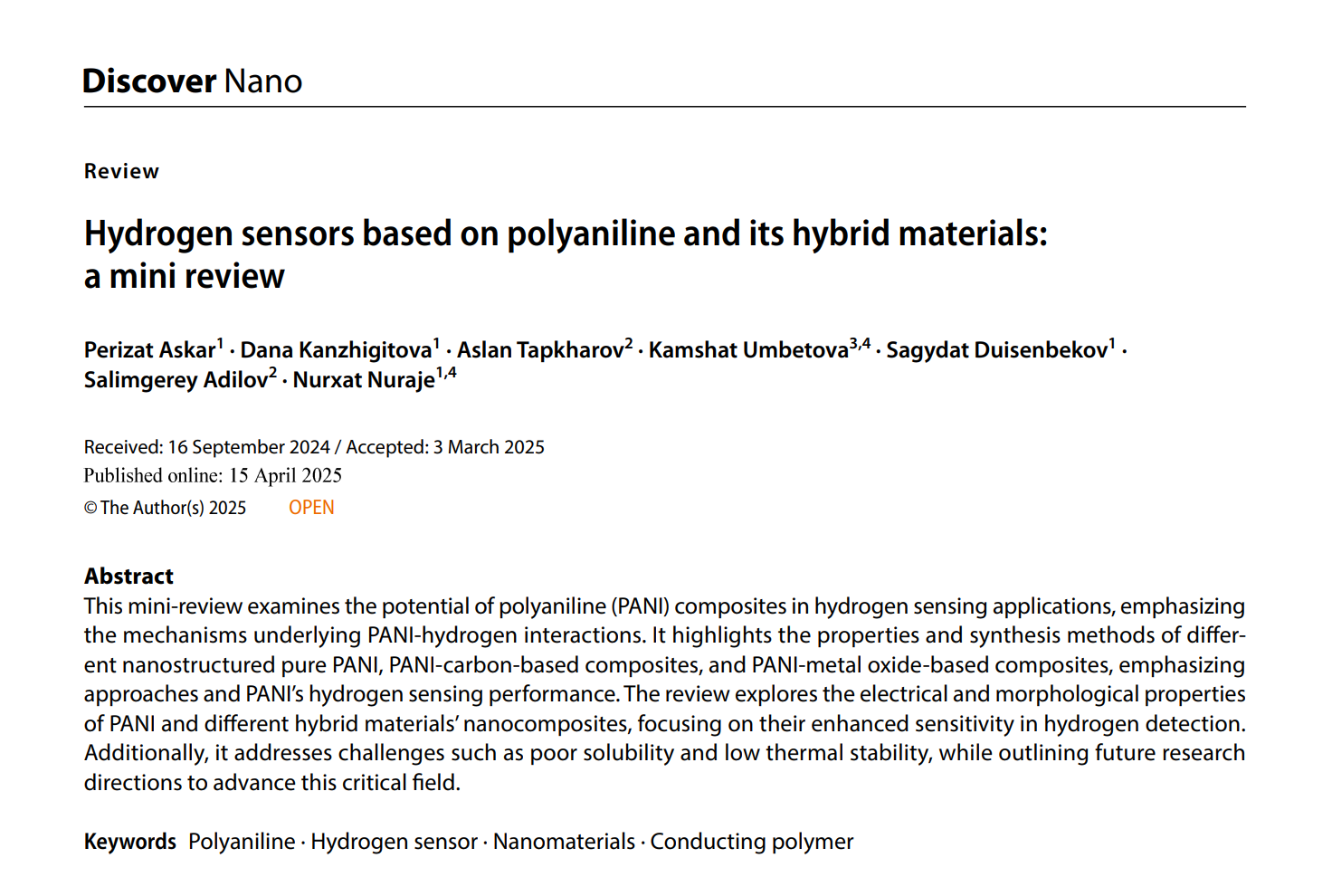 We’re proud to share that our mini-review "Hydrogen sensors based on polyaniline and its hybrid materials: a mini review" has been published in Discover Nano!